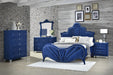 This fully padded blue velvet bedroom set is visually stunning, including beautiful channel tufting and contrasting welted trim arched head and footboards. Upholstered casegoods maintain the ambiance of this chic bedroom. Incorporating padded fronts, tapered chrome legs, single crystal-like pull knob buttons as well as glide side metal rails, and reinforced English dovetail joints. These offer abundant storage space to keep your new room clutter-free.