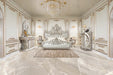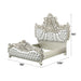 A luxurious antique silver finish with hand-brushed gold accents makes up the Sandoval bed. It is surrounded by fine Rococo scrolls and floral ornament crowns with stylized ribbons. Fine finishing touches, such as crystal-like buttons to add some gleam to the piece. The PU upholstery gives this bed a fresh contemporary touch. Five slats are included, and the use of a box spring is required.