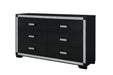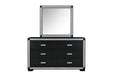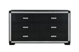 The Soleil Dresser offers both beauty and function. Its dark charcoal finish is wrapped with crushed crystal trim that catches the light beautifully, while its spacious drawers provide ample storage. Crystal-accented handles complete the look, making this piece as practical as it is dazzling.