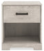 Give casual a new meaning with the chic look of this nightstand. A light gray finish over replicated oak grain keeps it laid-back and inviting, while the substantial warm pewter-tone hardware adds a modern farmhouse touch. The open cubby provides display space or accommodates a storage bin to add a delightfully relaxed vibe to your inner sanctum.
