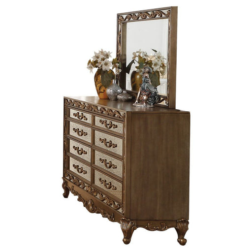 ACMEAntares - Dresser - Light Gray OakProduct Features 9 Drawer Case-Leg Wooden Frame with Mirrored Front Trim Wooden Block Leg Shape: Rectangular Case...