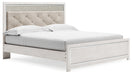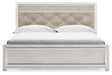 The epitome of fashion-forward design, this king panel bed is a beautiful blend of comfort and luxury. Shiny chrome-tone accents, a pearlized finish and button-tufted upholstery bring a glam touch to the richly rustic appearance. Remote-controlled LED lighting adds style and modern convenience to your restful retreat.