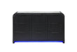 The Beckett Dresser features a black finish, white faux marble top, and drawer fronts with elegant, fluted detailing for a sophisticated, textural appeal. Built-in LED lighting adds a modern glow, while the spacious drawers provide ample storage. This piece perfectly balances style and functionality.