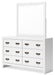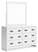 Details B427B9: Includes California king panel headboard, footboard, rails and slats, Made with hardwood solids, okoume veneer and MDF substrates, White finish, Foundation/box spring required, sold separately, Mattress available, sold separately, Assembly required, B427B1: Includes dresser and mirror, Made with hardwood solids, okoume veneer and MDF substrates, White finish, 6 drawers with dovetail construction and metal center guides, Hardware with dark finish, Drawer interiors are lined with a wood grain laminate for a clean, finished look, Mirror attaches to back of dresser, B427-46: Made with hardwood solids, okoume veneer and MDF substrates, White finish, 5 drawers with dovetail construction and metal center guides, Hardware with dark finish, Drawer interiors are lined with a wood grain laminate for a clean, finished look, B427-92: Made with hardwood solids, okoume veneer and MDF substrates, White finish, 2 drawers with dovetail construction and metal center guides, Hardware with dark finish, Drawer interiors are lined with a clean wood grain laminate for a clean, finished look,
