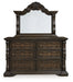 | Details | B947B5: Includes upholstered panel headboard, upholstered panel footboard and panel rails, Made with hardwood solids, oak and ash swirl veneers, MDF substrates and cast resin components, Dark brown finish, Polyester upholstery with button tufting, Foundation/box spring required, sold separately, Mattress available, sold separately, Assembly required, B947B1: Includes dresser and mirror, Made with hardwood solids, oak and ash swirl veneers, MDF substrates and cast resin components, Dark brown finish, 6 smooth-gliding drawers with dovetail construction (top drawer felt lined), Drawer pulls with antiqued goldtone finish, Mirror attaches to back of dresser, | |
