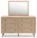 Clean-lined and contemporary—but far from stark—this dresser with mirror is a fresh style awakening. Pairing a light finish with replicated oak grain and textured beige details that replicate the look of cane, its mixed materials bring a naturally versatile vibe to your bedroom. Prepare to have your mind blown by the vast universe of possibilities that await within the spacious drawers. Whether you're prepping for work or getting ready to hit the town, the mirror will have you looking fabulous from every angle.