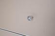 The 5-drawer chest features a stainless steel medallion as the focal design element, with crushed crystallized facets. Drawers are framed with stainless steel and the piece is fully upholstered with high quality textured vinyl in ivory.
