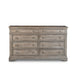 Highland Park features vintage styling in a classical bedroom collection. Sturdy construction using hardwood solids and veneers in a distressed rustic finish. The dressers eight spacious drawers offer side mounted roller bearing drawer glides for smooth open and closing. Gorgeous shaped moldings and framed drawer fronts accented by soft drawer pulls create an elegant farmhouse style for your room.