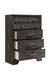 This bedroom set offers a sleek and stylish update to any space, featuring a rich, dark finish that commands attention while maintaining a sense of warmth and coziness. The bed stands as the stunning centerpiece, with its high, padded headboard upholstered in a plush fabric that invites relaxation and comfort. Flanking the bed are matching nightstands, providing convenient access to storage and display space. The set is rounded out with a capacious dresser, accented with a broad mirror that adds depth and brightness to the room.