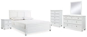 | Details | B680B4: Includes king panel headboard, footboard and rails, Made with hardwood solids and MDF substrate, White painted finish, Tapered feet, Foundation/box spring required, sold separately, Mattress available, sold separately, Assembly required, Bed is compatible with an adjustable base, B680B1: Includes dresser and mirror, Made with hardwood solids and MDF substrate, White painted finish, 7 smooth-gliding drawers with dovetail construction and ball-bearing side glides, Round metal drawer knobs with satin nickel-tone finish, Tapered feet, Mirror attaches to back of dresser, Assembly required, B680-46: Made with hardwood solids and MDF substrate, White painted finish, Round metal drawer knobs with satin nickel-tone finish, Tapered feet, Framed drawer fronts, 5 smooth-gliding drawers with dovetail construction and ball-bearing side glides, B680-92: Made with hardwood solids and MDF substrate, White painted finish, Round metal drawer knobs with satin nickel-tone finish, Tapered feet, Framed drawer fronts, 2 smooth-gliding drawers with dovetail construction and ball-bearing side glides, | |