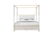 The Malmo King Canopy Bed is a stunning statement of modern luxury. Framed in a light beige oak veneer, it features acrylic posts accented with gold trim for a glamorous touch. The beige textured upholstered headboard adds softness and elegance, while matching gold accents on the canopy, headboard, and footboard complete the upscale look. With a fully slatted design for reliable support, this canopy bed is as functional as it is beautiful.