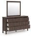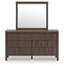 Crafted with both form and function in mind, this dresser with mirror brings a dash of retro-cool character to your modern boho aesthetic. Reeded accents add an on-trend touch to its classic silhouette. Warmly welcoming with a rich brown finish, this set pairs well with muted hues, earth tones and other neutrals alike. What a refined take on easygoing style.