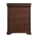 The Phillipe 5-Drawer Chest is the epitome of elegance and sophistication. With its sleek stained drawer panels, this piece will add a touch of luxury to any bedroom. The beveled edges throughout enhance its refined look, while also offering practical features like a top jewelry drawer with black felt lining to provide a safe and stylish storage solution. Crafted from fine poplar wood with a beautiful cherry finish, the Phillipe Chest is a timeless piece built to last.