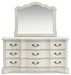| Details | B980B2: Includes headboard, footboard and rails, Made with hardwood solids, spruce veneer, MDF substrates and cast resin components , Antiqued white painted finish, Polyester upholstery, Button tufting, Foundation/box spring required, sold separately, Mattress available, sold separately, Assembly required, B980B1: Includes dresser and mirror, Made with hardwood solids, spruce veneer, MDF substrates and cast resin components, Antiqued white painted finish, 9 drawers with fully finished interiors, French and English dovetail construction and ball-bearing side glides, Metal bar pulls with aged pewter-tone finish, Mirror attaches to back of dresser, | |