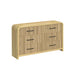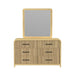 Enhance your bedroom with the stylish Ridgemont Dresser. Finished in a light wood with natural grain detailing, this piece brings warmth and elegance to any space. Sleek, rounded edges and vertical reeding throughout create a modern yet refined aesthetic. The dresser features a black felt-lined top drawer, providing protection and organization for your essentials. Spacious drawers, accented with bold black bar pulls, offer ample storage. With clean, minimalist lines, the Ridgemont Dresser combines function and contemporary design, making it an ideal addition to your bedroom.