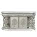A luxurious antique silver finish with hand-brushed gold accents makes up the Sandoval dresser. Surrounded by fine Rococo scrolls and floral ornament crowns with stylized ribbons. Featuring three convenient storage drawers and two-door storage compartments. The base has an intricate open design for a modern appeal. The spacious table top has enough room for displaying jewelry and perfumes.