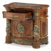 This bedside chest seems like it has been transported from an era when craftsmanship still reigned. Constructed with birch solids, veneers, pecan, and elm burl, in a classic finish, this chest is built to withstand the years. Note the marble pilasters and inset for the top, all detailed with the breathtaking leaf and foliage carving. The chest pulls open from a stunningly intricate floral handle styled in the shape of a sunburst. Within there is a spacious upper drawer, a broad middle chamber, and two side compartments for maximum functionality.