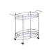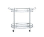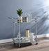 Instantly transform an ordinary room in to a minibar with this brilliant accessory. Two clear glass shelf allow you to display delicious drinks and delicate glassware. Supporting metal frame features a simplistic silhouette with chrome finish giving a modern touch. Two handle design and wheel stop make it easy to move around and place it where needed.