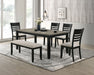 This dining group is the epitome of modern sophistication and functional elegance. The centerpiece is a sleek, rectangular table with a beautifully textured wood grain finish, offering a touch of rustic charm to its contemporary design. The table is complemented by a set of four ladder-back chairs and a versatile bench, all featuring a deep black frame that provides a striking contrast to the neutral, upholstered seats. The cushioned seating ensures comfort, while the bench adds flexibility and a communal feel, perfect for both family meals and entertaining guests. The overall design is enhanced by clean lines and a minimalist aesthetic, making this set a stylish focal point for any dining space.