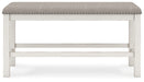 This counter height dining bench is sure to impress come mealtime. With its white finish and light gray upholstery, farmhouse-style seating has never been so fashionable. All that’s missing is you and your family.