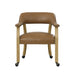 The Rylie Captain’s Chair effortlessly combines practicality and elegance. Outfitted with four independent casters, it offers unparalleled mobility, ideal for dining rooms, offices, or as a sophisticated addition to living spaces. Its solid wood legs guarantee both durability and stability. Wrapped in fade-resistant camel vegan leather and adorned with copper nailhead trim, this chair radiates lasting beauty. The natural, light finish highlights the wood’s intricate grain, creating a fashion-forward appearance.