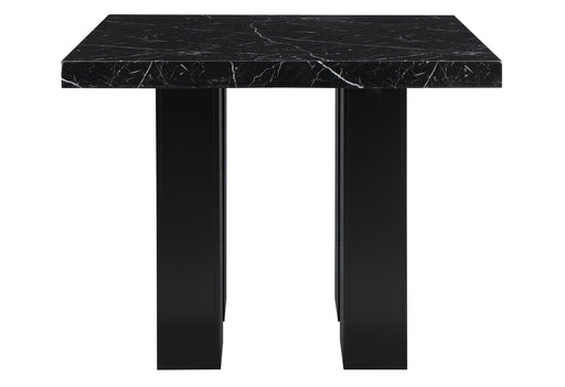Global Furniture USABlack Faux marble counter table design with an extra thick top and a double pedestal base with silver connectors. The chairs have nail head trim ta...
