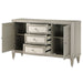 Give your dining space a much-needed storage solution with the Elyssa server. This server features three ample drawers and two side cabinets for all your extra dishware, glassware, and linens. The drawers showcase synthetic leather quilted drawer fronts. The piece sits on eight beautifully crafted fluted wooden legs. It is finished in a champagne color that adds a stylish touch.