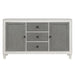 Add much-needed storage to your dining area with the Katia server. This server features three ample drawers and two side cabinets with a shelf on each side, perfect for all your extra dishware, glassware, and linens. The drawers and cabinet doors showcase gray fronts for a contrast to the weathered white finish of the outer frame. Metal hardware and wooden legs complete the piece. The piece sits on eight beautifully crafted fluted wooden legs.