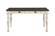 The Joanna Farmhouse Dining Table adds a beautiful dimension to any dining area. Measuring 59.5 inches in length, this table comfortably seats six and is ideal for medium-sized dining rooms. Expertly crafted with high-quality materials, the Joanna Farmhouse Dining Table boasts a wire-brushed ivory and mocha finish that enhances its rustic charm. Its turned legs add to its elegant design, while the four working felt-lined drawers provide ample storage for your dining essentials. Functional and stylish, this dining table is perfect for hosting dinner parties or family gatherings. Its unique texture adds depth and character to the wood, making it a standout piece in any dining area. Experience the perfect blend of style and functionality with the Joanna Table. Its solid construction, elegant turned legs, and convenient felt-lined drawers make it a durable and sophisticated choice for any home.