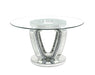 Place this gorgeous Ningbo dining table in any modern setting. The mirrored base durably supports the round clear glass top, which allows the beautiful curves to be highlighted. The panel mirrored base features inlaid faux diamonds that both reflect light and will illuminate your dining space. The matching side chairs are padded with beige leatherette cushions, offering comfort while drawing attention to the elegant chrome finish metal frame.