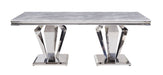 Contemporary flair graces classic silhouettes to create a timeless design that will blend with any home style. The stainless steel pedestals base features sleek, uncluttered lines in geometric form, with mirrored silver finish emitting a modern glitter. Light gray faux marble top above the metal base brings this table an elegant and smooth touch that complements your beautiful dishware. Traditional elegance and modern glamour are in harmony with the Satinka Dining Table.