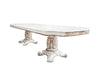 Commanding attention in any space, the impressive design of the Vendom double pedestal dining table will impress everyone. Adorned with classic elements including scrolls, curved shapes, and leaf molding accents to create an old-world charm. The antique pearl finish is accentuated with hand-brushed gold to make the molding details stand out.