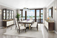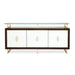 The Belmont Place Sideboard is where form meets function in an exquisite ballet of design.Elevate your dining experience with a surface crowned by a floating glass top, supported by alluring Japan plated alloy pedestals. The serene anigre veneer doors, adorned with gold trims, open up to unveil versatile storage spaces and drawers, each lined in sumptuous velvet.
