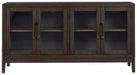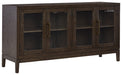 | Details | Made of wood, oak veneer and engineered wood, Dark, waxy brown oak finish, Metal accent bar pulls with brass-tone finish, 2 glass front cabinets with double doors, Cabinets with single adjustable shelves, Assembly required | |