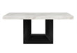 White Faux marble design with extra thick top and a large angle cut wood base. The black upholstered chairs match the base the nail head trim accents the seat and back.
