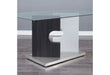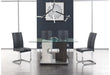 What host wouldn't want to entertain family and friends around this elegant and spacious contemporary dining table? This attractive table features a striking double pedestal base in gray wash and white finish, glass top and metal glass supports to complete this modern look. Quality craftmanship in every facet makes this a must have for your dining space.