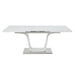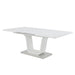 This Kamaile dining table is modern and stylish, and the smooth white high gloss is inviting in any dining space. The extending dining table features a beautiful chrome base with an open U-shaped pedestal and is complimented by a wooden top. The tabletop can be easily expanded to accommodate additional dining guests.