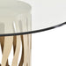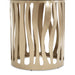- Round metal pedestal features a cutout “flame” design in Chardonnay