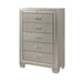 The Platinum Youth Chest is sure to delight your glamour queen! This chest of drawers comes with five spacious, perfect for keeping all of your belongings neatly stored away. This vertical chest features a mirror glass trim along the front, while the chrome drawer handles feature crystal-like accents. This chest comes in a chic, champagne color adding instant glamour to your little ones bedroom. Sleek, clean lines with bracket feet complete the look of this glamorous chest.