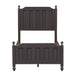 Fall into the cottage view panel bed at night. Crafted of melamine and a rubberwood solid frame, this piece features a dark gray finish, a square post bed with round finials and slat overlays, anchored by bun feet. Never question the reliability of this bed with the hook on rails and center supported slat system. This piece is offered in an alternative finish, sure to complement any space effortlessly.