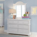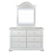 Live life beautifully with the Summer House I panel bed, dresser, and mirror. Crafted of poplar and pine solids this kit features an oyster white finish, bead molding, bun feet, full extension drawers with felt lined top drawers, and is accented with wooden knob hardware. The panel bed features louvered panels and arched crown molding. The dresser has six drawers of storage and pairs well with the arched louvered panel mirror with a beveled edge and bolt-on supports. With cottage design always in fashion, make the Summer House I a staple in your home.