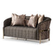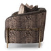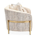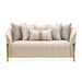 Discover elegance with our captivating loveseat, blending a striking gold metal frame, graceful curves, and chenille fabric. The alluring Tiger Eye chenille jacquard adorning the back, along with matching pillows, creates an intimate and refined ambiance.