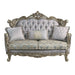 Oozing with elegance and refinement, the Miliani loveseat makes for an alluring living space. With beautiful scroll legs and shell carvings throughout the trim for a classic touch. The button tufting not only adds a decorative element to the piece but also serves a functional purpose. It helps to secure the padding or cushioning underneath, preventing it from shifting or sagging over time. The nailhead trim accentuates the beauty of any piece of this piece. The two-tone fabrics and bronze finish modernize the traditional style of this loveseat and gives it an edge. Three throw pillows are included.