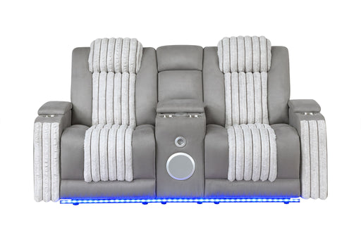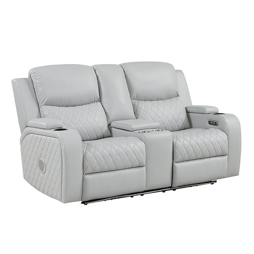 ACMEElonzo - Power Motion Loveseat With Console, LED, Power Headrest & Speaker - Light GrayProduct Features Seat Construction: Pocket Coil Wooden I...