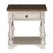 Combine traditional living and todays modern lifestyle effortlessly with the Morgan Creek. Crafted of poplar solids with pine and birch veneers finished in antique with spatter and watermark accents with a planked top. Features pewter nail head corner accents, one full extension drawer in each table, a bottom shelf for additional storage, cocktail is castered for easy moveability, anchored by round turned legs flowing into bracket feet. The warm antique finishes and artistic distressing along with grand scale, makes this collection can be passed on for generations. Kit consists of one rectangle cocktail table and two rectangle end tables.