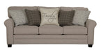 Lewiston a Farmhouse Casual style with a sock arm treatment, wooden legs, and included accent pillows. Product . "Farmhouse Casual" Styling. Soft "Heathered" Polyester Body Fabric. Transitional Sock Arm Design. "Family Is Forever" Mood Pillow Included. Steel Tech Framing. Wooden Legs. Comfort Coil Seating featuring Comfor-Gel.