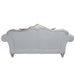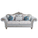 Create a more luxurious and comfortable living room with this classic Pelumi sofa. This living room sofa features a wooden design with platinum wooden trimmings. The sofa comes with pocket coil seating for comfort. The back is cushioned and designed with a camel back silhouette. Upholstered in light gray linen fabric for an airy touch. Eight accent pillows are included with the sofa. The rolled arms and tapered legs give this piece an antique look.