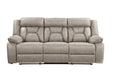 An 86″ long feature-packed comfort excursion, the Tyson manual reclining sofa checks off all the boxes for a living room. A Drop-down center console adds two cupholders, two electrical outlets and two USB charging ports and makes it the center of the action. The console lifts out of the way and adds an extra seat when guests arrive. The gray leatherette cleans simply with the wipe of a damp cloth and is breathable for added comfort.