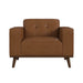 The Destiny Chair with Wood Front exudes the coveted charm of mid-century modern style. Built with framing of quality solid and engineered wood that is full upholstered in quality faux leather, this piece is built for durability. Comfortable foam cushioning, decorative tufting on the backrest, and track arms forming sleek and modern lines culminate to mark thoughtful design, while an exposed front rail and wood legs highlight excellent craftsmanship. For a refined and sleek addition to your living space, the Destiny Chair with Wood Front delivers in quality and style.