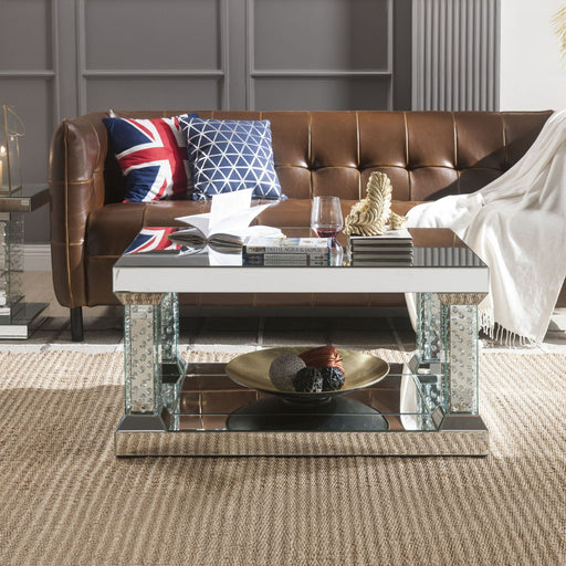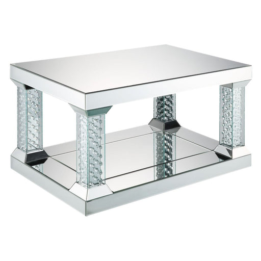 ACMENysa - 36" Coffee Table - Mirrored & Faux CrystalsProduct Features Rectangular Coffee Table Storage: Open Compartment (Mirrored Base Shelf) Bev...